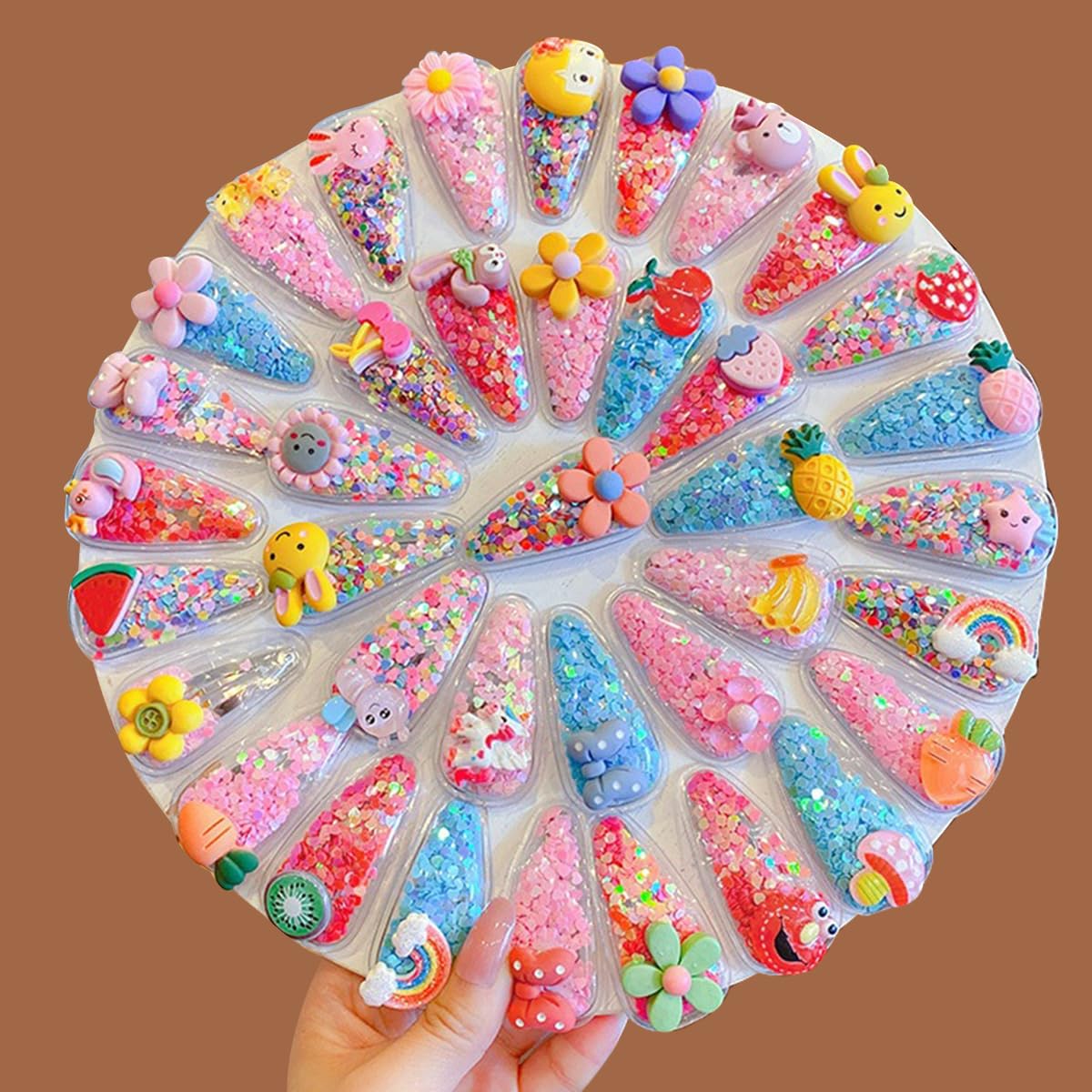 - 🎁🌺😀You will receive 30pcs mixed styles of shiny quicksand girl hair clips,plenty in quantity and various styles,including cartoons,fruits,flowers,animal patterns,etc.,provide a variety of choices for your dress,let your little girl Stand out every day.