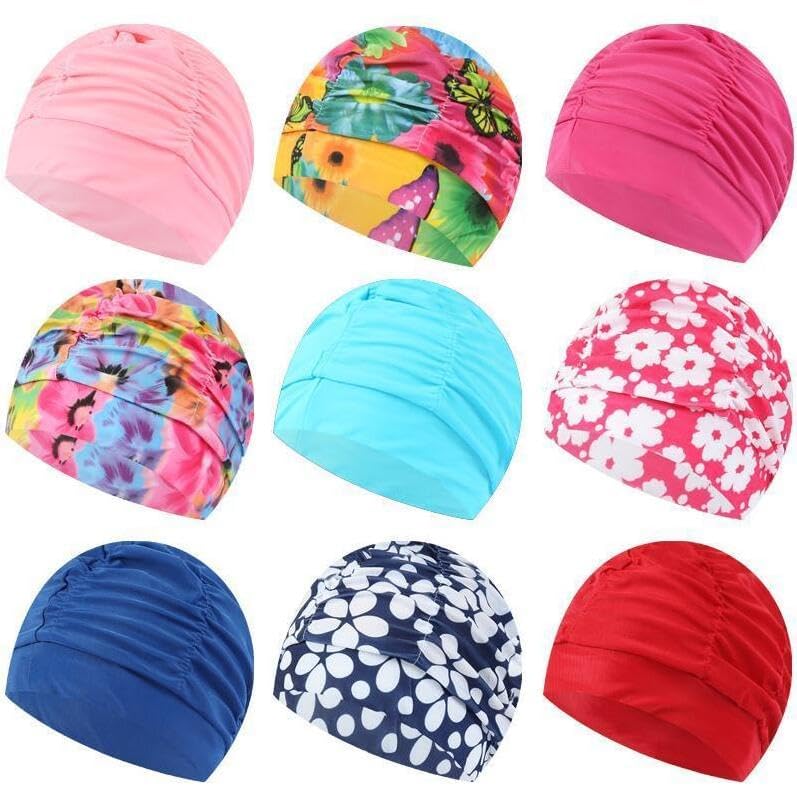 Ewanda store 6 Pcs Colorful Print Swim Caps for Women Men,Pleated Nylon Cloth Swim Cap Large Swimming Cap Bathing Caps for Adult Men Women Long Hair